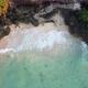 Distacing birds eye view on small beach between cliffs on sunrise in Nusa Dua Beach Bali Indonesia. High quality aerial top down 4k footage