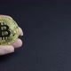 Bitcoin coin in the hand on dark background with copy space, bitcoin mining.