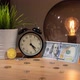 Close-up view of bitcoins, lamp, vintage alarm clock and small bundle of dollars on table changing into large wad of cash in half-hour, concept of bitcoin price surge