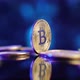 A physcial Bitcoin spinning fast in a short loop on a dark blue digital business-style background with reflection