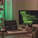 Rear-view stab shot of African-American IT specialist hacking software on computer sitting at desk in office with red and green lighting together with colleague. Program code running on black screen