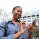 Black woman typing on the phone in the city with buildings and skyscrapers on background. Smiling adult woman in Chicago, holding her smartphone and sending messages. Lifestyle and technology concepts. Slow motion