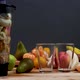 Fruit in a blender and on the table before mixing, close-up.