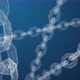 Blockchain node connection structure in decentralize data network technology, digital particle wireframe of 3D chain in blue abstract background concept