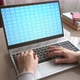 Blue binary code. Hexadecimal program code on screen. The girl working at home office hands on keyboard.