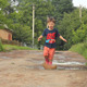 boy running through puddles