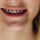 Braces, beautiful smile women, crazy girl and smile, emotional girl with braces, on blak background, closeup
