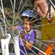 Father and son repairing the bike while mom pushing her bicycle away