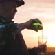 Brewing concept. Farmer brewer carries fresh cold beer through a field. Senior man in checkered shirt tasting beer. Professional brewer tasting fresh beer at sunset. Ranch growing fresh hops.
