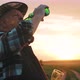 Brewing concept. Farmer brewer carries fresh cold beer through a field. Senior man in checkered shirt tasting beer. Professional brewer tasting fresh beer at sunset. Ranch growing fresh hops.