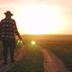 Brewing concept. Farmer brewer carries fresh cold beer through a field. Senior man in checkered shirt tasting beer. Professional brewer tasting fresh beer at sunset. Ranch growing fresh hops.