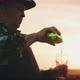Brewing concept. Farmer brewer carries fresh cold beer through a field. Senior man in checkered shirt tasting beer. Professional brewer tasting fresh beer at sunset. Ranch growing fresh hops.