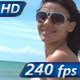 The girl in an elegant wedding dress standing on the beach. The camera zooms in, she turns to her and smiles. Slow Motion at a rate of 240 fps.