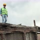 Bridge collapse. Destruction of structures across river with collapse of sections into water. destroyed bridge. old, broken asphalted over river. Road civil engineer evaluates results of destruction