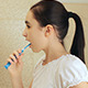 Cute little girl intensely brushing her teeth in the bathroom. I included the original and the stylised version in the main file.