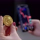 Person holding Bitcoin in hand and checking market charts on a smartphone.