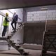 Two construction workers wearing hard hats going downstairs in unfinished building and discussing work progress