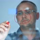 Businessman Write Algorithm Diagram On Transparent Screen In Office. Business And Financial Success Concept.
