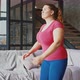 Buttocks workout. Young overweight lady practicing deep squats exercise, fitness training at home, slow motion, side view
