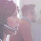 PAN of female helpdesk operator with headset talking with client on voice call in bright office
