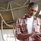Carpenter using his tablet in a work shop