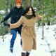 Tilt down the winter forest with young adults playing tag