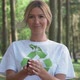 Caucasian female volunteer holds a small flower plant in her hands and looks at the camera, a metaphorical action, nature is in our hands, caring for nature.