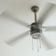 Ceiling fan is rotating at the ceiling of the room. Electric climate equipment.