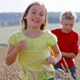Energetic boys and a girl chasing each other in the fields trying to outrun each other.