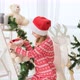 Preteen child girl plays with teddy bear toys near to Christmas tree wearing red Santa hat. Beautiful female kid in New Year and Xmas time