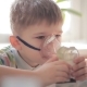 The little boy makes treatment procedure by an inhaler where upper respiratory tract infection and heavy breathing