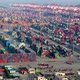 Timelapse large Chinese containers in Yangshan Port of Shengsi terminal with red and white operating cranes in Shanghai against hill silhouettes