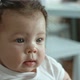 Lovely little baby girl with cute chubby cheeks sitting with mother and looking at something with open mouth in surprise