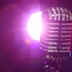 Classic microphone rotating and reflects stage lighting on background lamp stroboscope in dark. Close-up