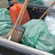 Cleaning tools and garbage collected in the palace. Green bags with garbage on it is ready for transportation.