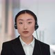 Client support service. Close up portrait of positive friendly asian woman helpline operator wearing headset smiling to camera at office, slow motion