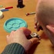 Bald male clockmaker disassembling some mechanical clock. Close up of mature man unscrewing the screw from the clock mechanism. Caucasian watch repairer using tweezers at his work. 4k footage