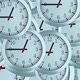 Many 3d simple clocks with hour, second and minute arrows, computer generated modern business background