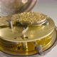 Clockwork mechanism with rotating spring, gears, gearing and toothed wheels. Round wheel with a carved pattern from curlicue on an antique gold clock. Old vintage clockwork working on a white background. Internal movement of watch in extra close up.