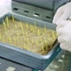 close up, gloved hands of lab worker reviews growing young green sprouts in soil, in small box, in laboratory. Science laboratory research, biotechnology, GMO concept.