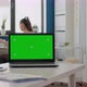 Close up of empty desk with green screen on laptop in startup office. Computer with isolated template, chroma key background and blank mock up in business space. Copy space chromakey