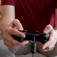 Close up of young man holding game controller while playing video console game. Asian guy using gamepad joystick at home.