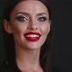 Smiling brunette elegant woman with red lips taking of hands from face to show professional makeup and looking at the camera on the black background, glamour make up for fashion model