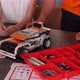 Close-up of a group of children playing with robots assembled from plastic parts at a Desk with a computer in a robotics school. Children program the robot.