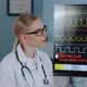 Close-up of beautiful female doctor in lab coat discussing EKG data with colleague showing on big display in modern sports lab.
