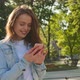 Close-up shooting. A cheerful girl is standing and texting on the phone. She is laughing and listening to music with small headphones. Her hair is fluttering in the wind. The summer sun is shining. City and trees in the background. 4K