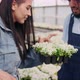 Closeup. Modern Eco Supermarket or Organic Store. Curly Male Gardener or Business Owner Helping to Female Customer Choice Flower. Multi Ethnic People Standing in Big Greenhouse. Shopping Bag.