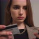 Closeup. Portrait of young woman holding credit card and smartphone at home or office. Woman shopper using instant easy mobile payments making purchase in online store. E-banking app service. High quality 4k footage