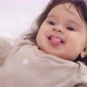 Close-up.Happy baby girl is lying on her back on a white bed, dressed in a beige bodysuit with white peas, smiling from her mother’s tickling, playing with her mother, showing her tongue