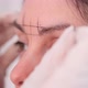 Close-up. Thread with black paint, beautician draws the shape of the eyebrows.
